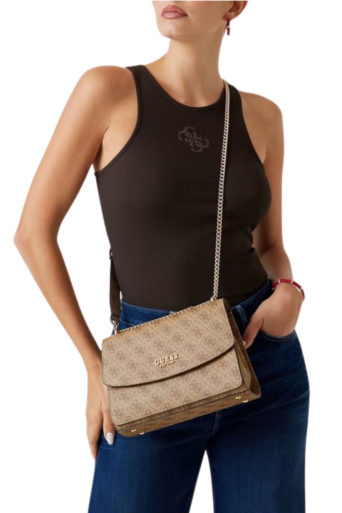 - Μοντέρνα γυναικεία τσάντα ώμου-χιαστί της εταιρείας Guess.