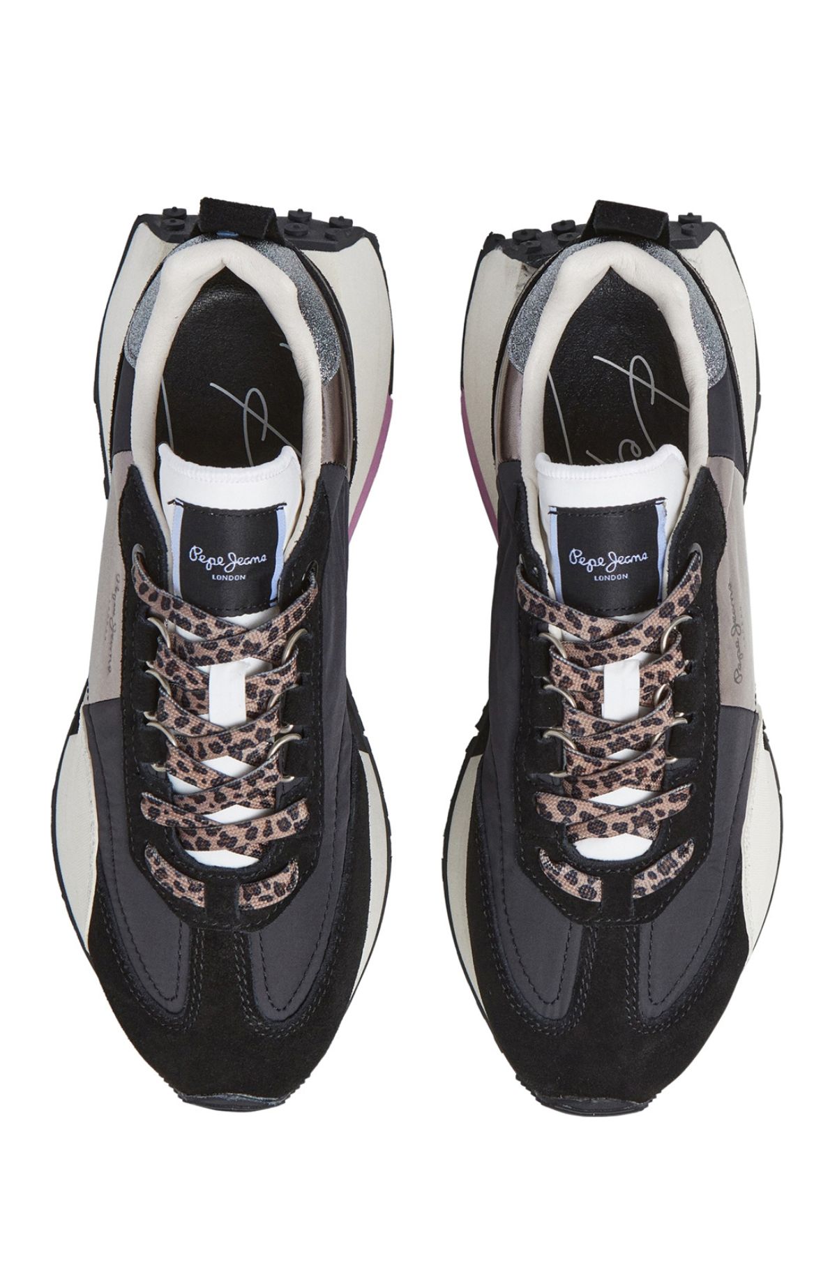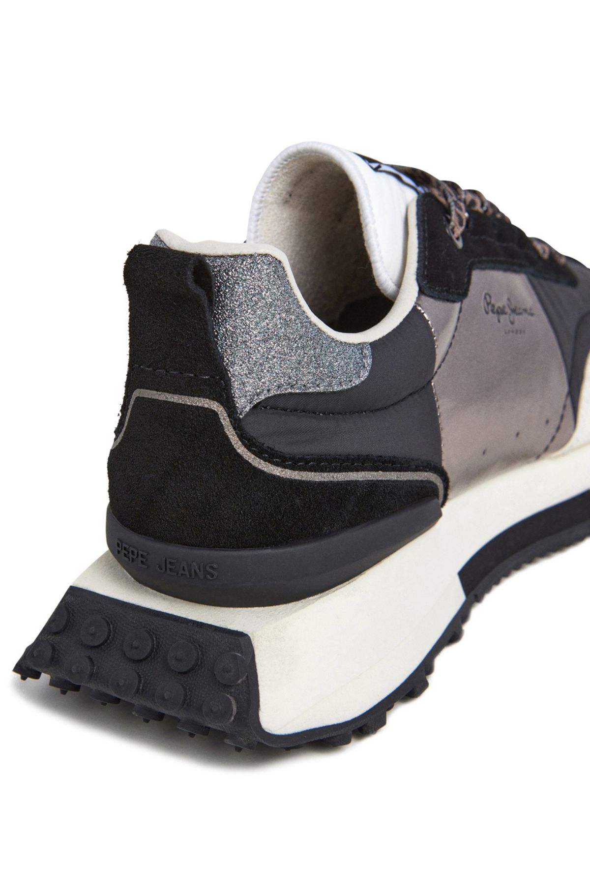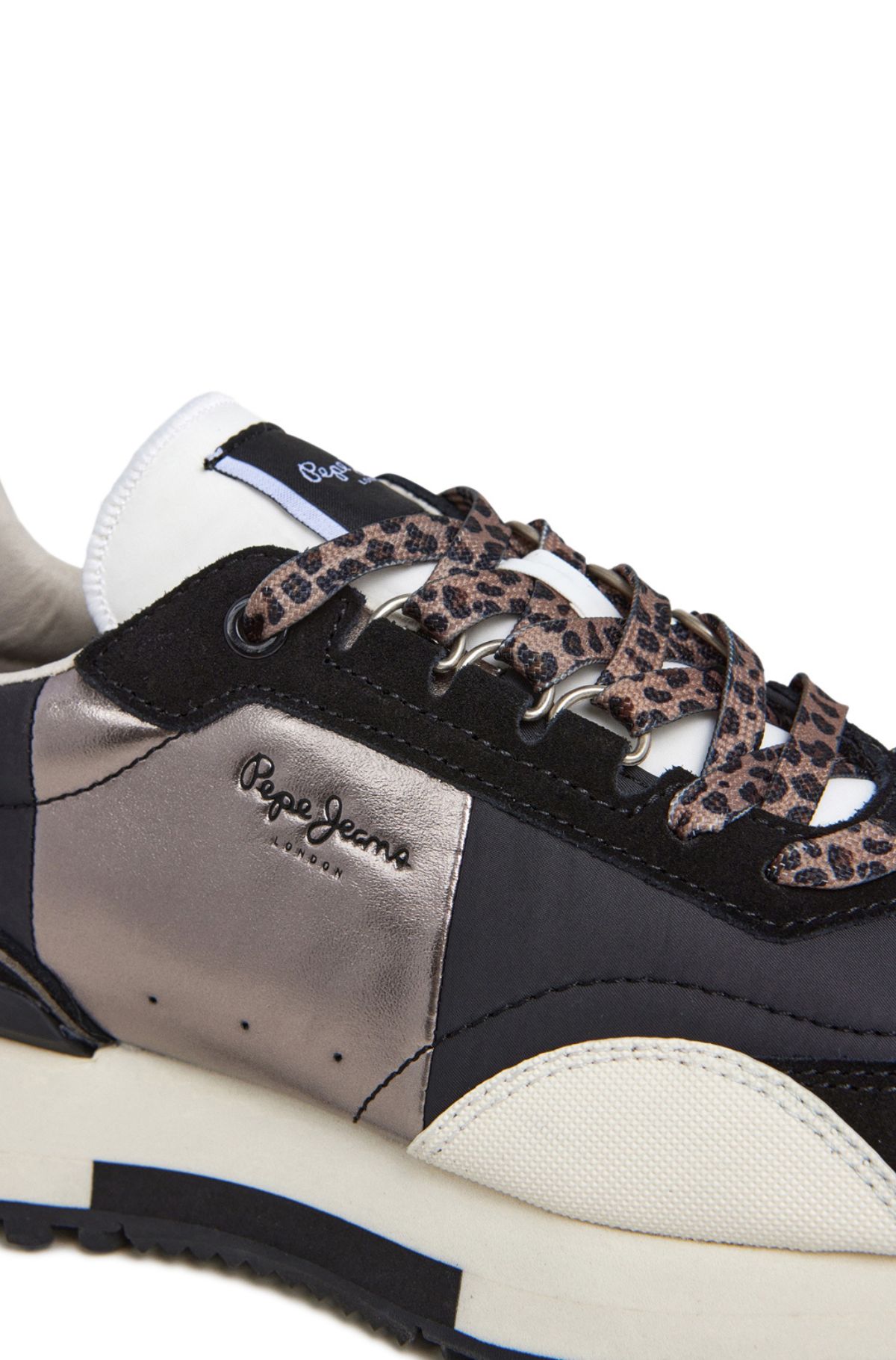 - Sneakers από συνδυασμό υλικών και δέρματος, με υφασμάτινη εσωτερική επένδυση & κλείσιμο με animal print κορδόνια. Ενδιάμεση σόλα EVA, rubber εξωτερική σόλα, σταθεροποιητής φτέρνας με ανάγλυφο logo & ένθετο στο πίσω μέρος με glitter. Ανάγλυφο logo Pepe Jeans στο πλάι & ετικέτα logo στη γλώσσα.