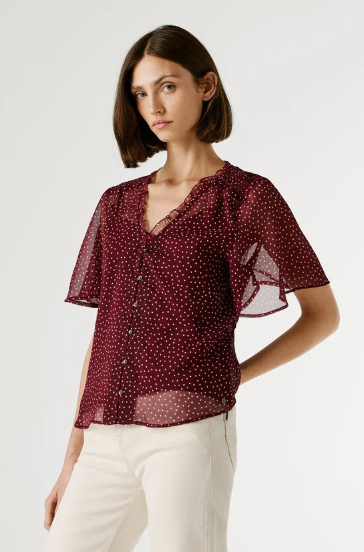 – V-neck with mini ruffles at the edges