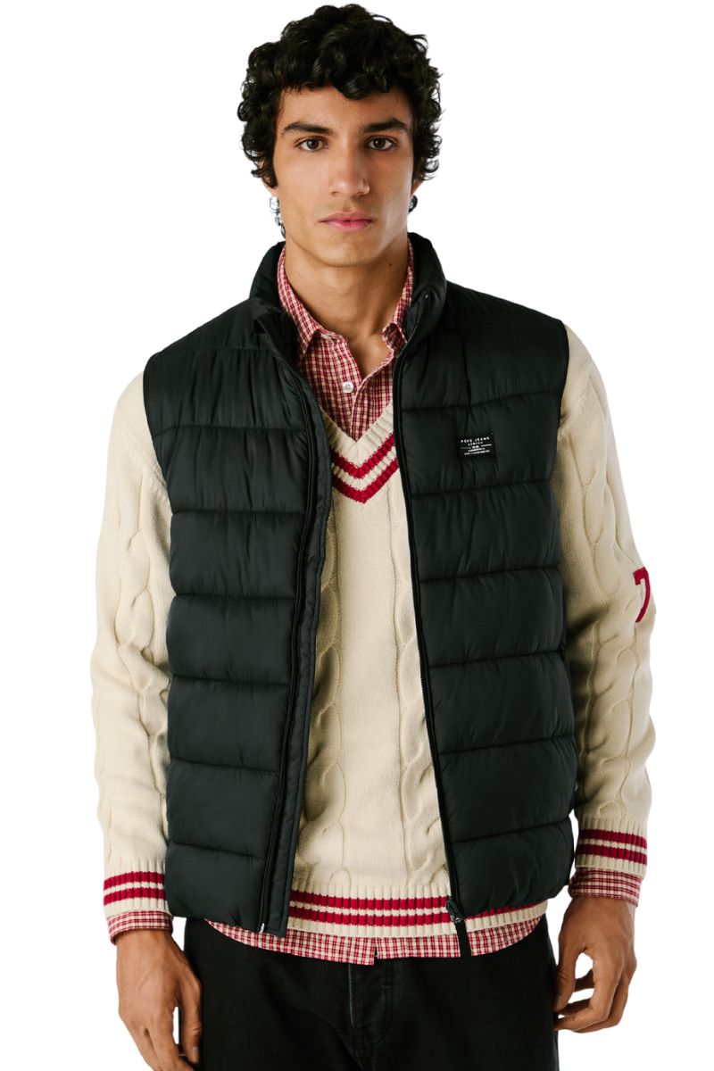 • Γιλέκο puffer, καπιτονέ με εσωτερική επένδυση, ψηλό λαιμό & κλείσιμο μπροστά με φερμουάρ. Δύο τσέπες στο πλάι & ετικέτα logo Pepe Jeans στο στήθος.