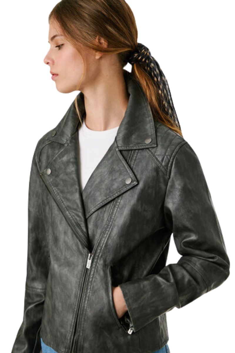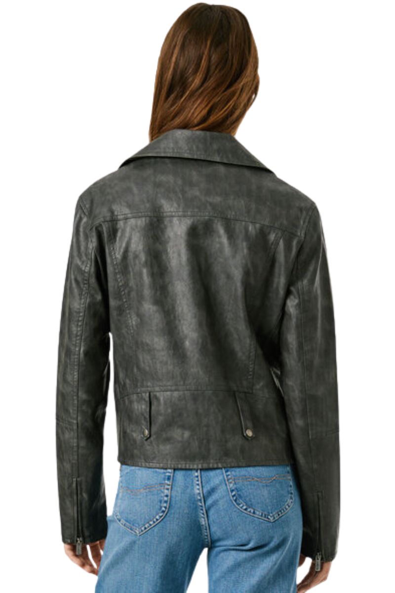 - Μπουφάν biker, με γιακά και πέτο, καπιτονέ ώμοι & λοξό κλείσιμο μπροστά με φερμουάρ. Δύο τσέπες στο πλάι με φερμουάρ, φερμουάρ στις μανσέτες & ανάγλυφο logo Pepe Jeans στο πίσω μέρος.